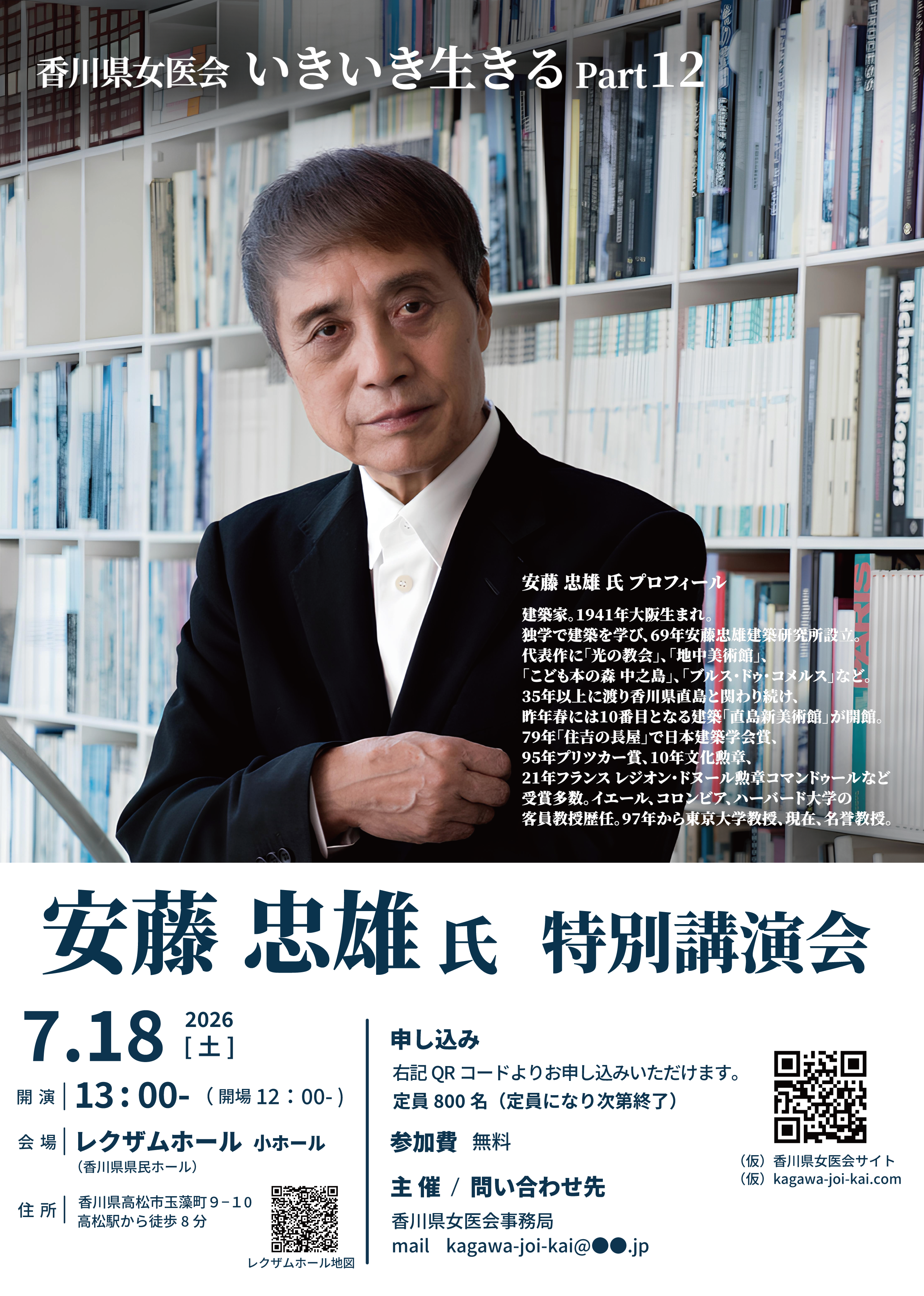 「香川県女医会では「いきいき生きる」をテーマに、これまで11回の講演会を開催してきました。節目の第12回となる今回は、世界的な建築家・安藤忠雄氏をお迎えします。先行きの見えない時代ですが、安藤さんの力強い言葉から、情熱を持って前向きに歩むためのヒントを一緒に見つけてみませんか?」